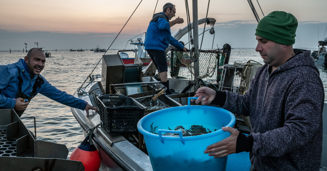 Before dawn in Goro, on the Adriatic Sea, Massimo Genari drove by the central roundabout, with its sculpture of two concrete clams in