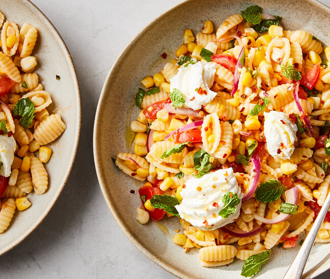 Melissa Clark’s new recipe for pasta with corn, mint and red onions has a lot going for it. It’s quick — only 25 minutes or so from start to finish — and it’s vegetarian, making it an excellent weeknight option for anyone leaning into a plant-based diet. It ticks all the flavor boxes: sweet kernels of corn, refreshing mint, piquant onion and acidic tomatoes. And it’s just as delicious eaten at room temperature (or even cold) as it is straight from the pan, making for a desk lunch your co-workers will covet.