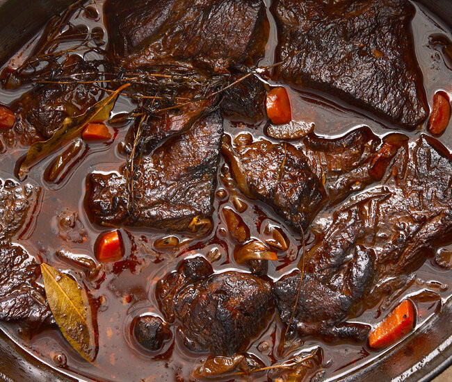 For you, then, this incredible bourbon-braised beef (above) that Vallery Lomas developed for us. The whiskey adds a fantastic complexity to a cheap cut of boneless beef chuck burbled with maple syrup, caramelized tomato paste, thyme, bay leaves and hints of both soy sauce and lemon juice. It’s as Irish as Carmela Soprano, but I’d serve it to your ma tonight with no misgivings. (Save the leftover braising liquid to make French onion soup.)