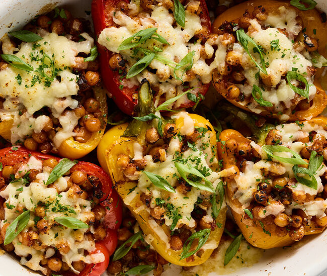 Though my recipe draws inspiration from those distinctively American peppers, it takes a few liberties. I’ve made these vegetarian, for a start, by replacing the meat with earthy chickpeas, and kept things lighter by leaving out the rice. The cheese stays, obviously.