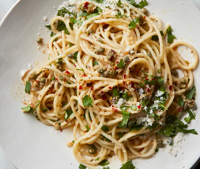 Enter: this midnight pasta with garlic, anchovy, capers and red pepper (above) from David Tanis. It’s a five-star recipe for a reason, mainly because it tastes luxurious, dressed with anchovies melted into garlicky, spicy oil, but also because it’s supremely simple.
