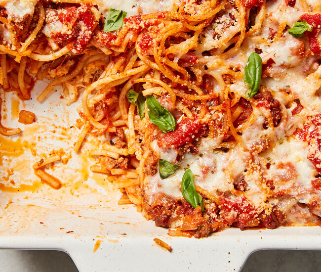 Don’t let the cooking time scare you — most of that hour and a half is spent in the oven. Aside from chopping an onion and however much garlic you like (I’ve always read the garlic amount in recipes as a minimum), the rest of the prep time is spent on easy stirring and mixing. Baked spaghetti bends to you: Swap in the Bolognese you stashed in the freezer for the jarred marinara, use Italian chicken sausage instead of ground beef, tuck in some leftover roasted vegetables. Just don’t skip the ricotta and mozzarella, which turn this baked pasta into an instantly lovable spaghetti-lasagna hybrid.