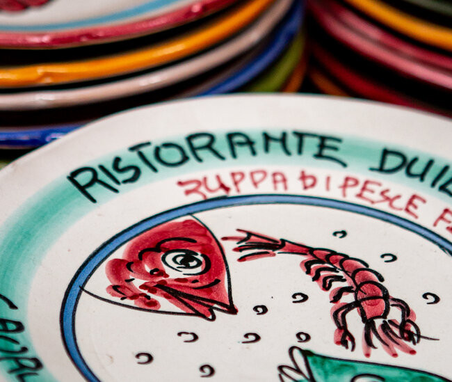 It is served on Buon Ricordo plates with a design depicting the Italian and American flags and a gray boar standing in a coil of yellow pasta. They were produced at a factory in Vietri sul Mare, on Italy’s Amalfi Coast, which has been using local clay to make the tableware since it was introduced six decades ago.