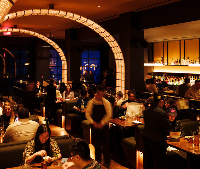 Beef or chicken? The restaurateur Simon Kim now has you covered either way. An owner of the Korean steakhouse Cote is opening what he calls a “fried chicken cathedral,” with a dining room framed by glowing, barrel-vaulted arches that disappear to infinity, thanks to a rear wall mirror. The design is by the Rockwell Group, involving David Rockwell’s personal touch. But the food is Mr. Kim’s idea, more than four years in the making, with the executive chef Seung Kyu Kim in charge (no relation to the owner, though the two met while working at Jean-Georges). Simon Kim’s notion is to offer a mix of American and Korean approaches to fried chicken and give it glamour with (supposedly) more sustainable ingredients in a more elegant setting. At Coqodaq it’s one-size-fits-all, a $38 dinner that includes chicken soup; a bucket of chicken parts fried in a gluten-free batter based on rice flour, chicken glazed with gochujang or soy and garlic; a cold perilla noodle dish; banchan, small dishes, that include palate-cleansing white radish; and soft serve frozen yogurt. Starters (extra) include some seafood options. The chickens are pasture-raised in Pennsylvania Amish country, and triple-fried in oil produced in Iowa from fermented Brazilian sugar cane. The name of the restaurant blends French, American and Korean words for chicken. The sommelier, Victoria James, who also curates the wines at Cote, has a wine list that features Champagne, which she and Mr. Kim agree is the ideal beverage for fried chicken. Her list offers 400 of them, and other sparklers by the glass and the bottle. Considering that fried chicken is finger-food, in the front of the restaurant, there’s a hand-washing area with three sinks. Some high-top tables near the entrance are for walk-ins, there’s a long bar, and garage doors will open to an outside patio in warmer weather. Tables at the leather-upholstered booths beneath the arches in the 190-seat room have lazy susans, the better for sharing. (Opens Friday)