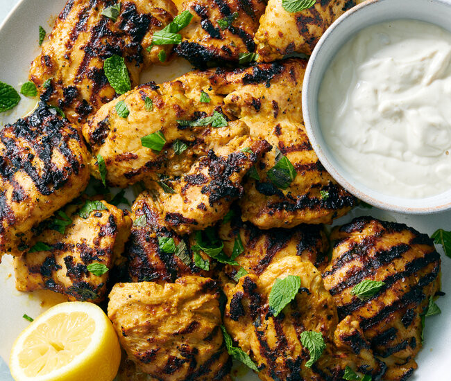 Marinated with whole-milk yogurt and shawarma-inspired spices, both white and dark meat end up tender and flavorful. Serve right off the grill or at room temperature.