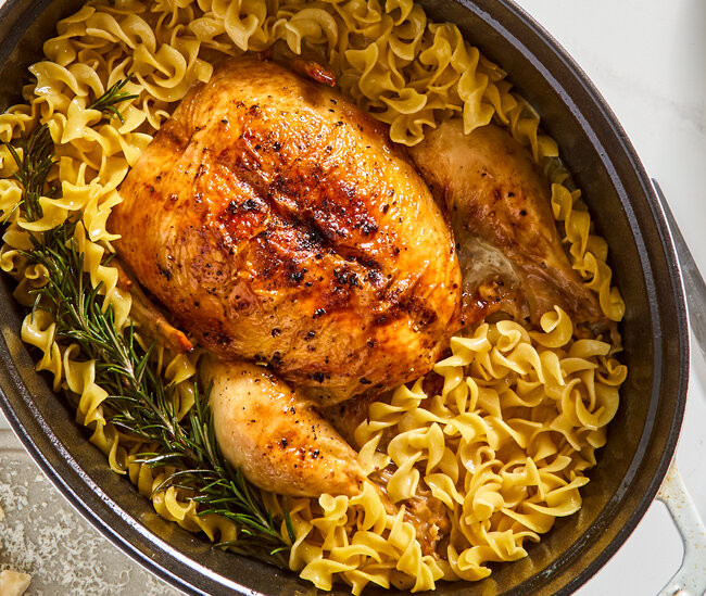 This recipe splits the difference. It begins by roasting a whole, butter-rubbed, Parmesan-rind-stuffed chicken and a head of garlic under high heat. The skin and butter brown, the garlic sweetens, the bird infuses with the nutty flavors of the cheese. The pot is deglazed with water, less than you would use in a soup, but more than for a braise. Then, the noodles cook in the same pot so they can take in all that flavored broth. In a final act of generosity, the noodles share their starches with the broth, thickening it into a sauce.