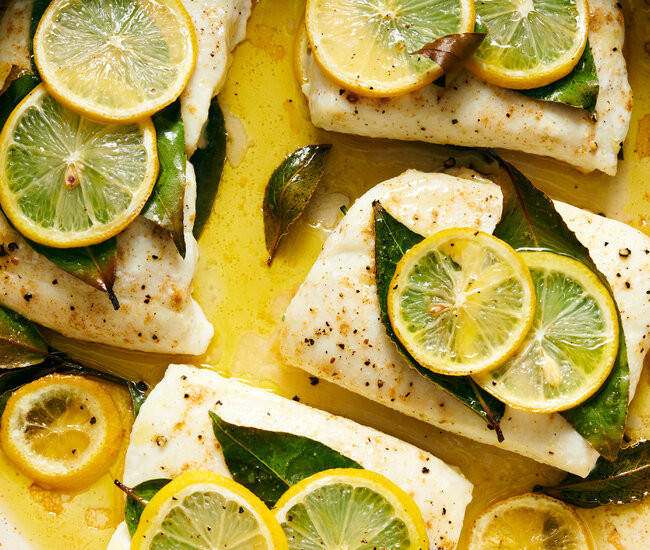 Use any firm-fleshed white fish fillets, such as halibut, snapper or rockfish. The fish can be roasted, uncovered, in a hot oven or a covered grill, or broiled. The lemon and bay get slightly charred, and their perfume immediately infuses the fish in a beautiful way.