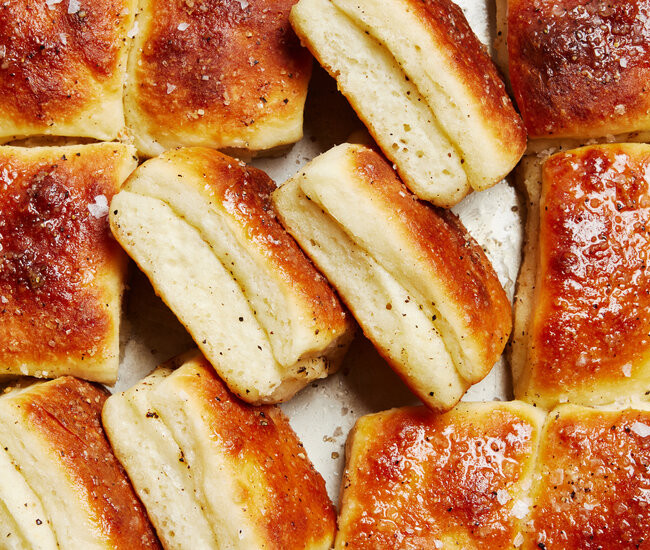 I tweaked this basic recipe by seasoning the butter with black pepper and crunchy Demerara sugar. The seasoned butter gave a sweet-spicy complexity to the rolls, and the sugar caramelized and became candylike wherever it met the metal of the pan. (You can also use the same seasoned butter with the shortcut rolls.)