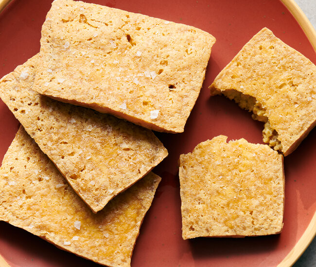 For his crispy tofu (above), you don’t need panko or cornstarch. Just drain your tofu and slice it into slabs, then freeze it. When you’re ready to cook, pat and lightly press the tofu to get only some of the water out (squeeze out too much and the final product will end up too dry) before oiling, seasoning and roasting.