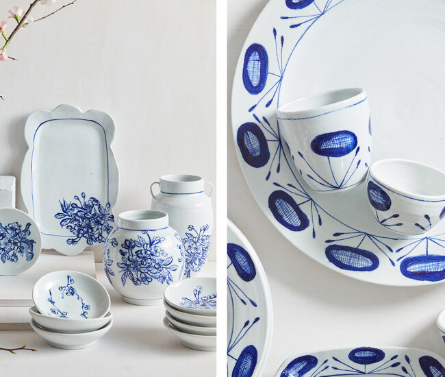 For over 20 years, Melissa Goldstein worked as a magazine photo editor. While researching imagery, she developed a fascination with Scandinavian ceramics, 17th-century botanical illustrations and Japanese woodblock prints dating back to the 1500s. It wasn’t until she moved to Brooklyn and began rehabilitating the overgrown garden behind her brownstone that she began combining her interests: “[My brand MG by Hand] was the merging of my research, the garden and making things for my family,” Goldstein says of the fine English porcelain ceramics she now sells in select shops and online. In 2008, the artist began hand-making everyday dinnerware in her home studio in Carroll Gardens, decorating the pieces with floral motifs in a cobalt stain. Black irises, poppies and flowering quince from her garden adorned vases, shallow banchan dishes and scalloped serving trays. Her new Poppy and Cherry collections, which were fired in a gas kiln for 12 to 15 hours, channel Dutch Delftware while depicting local flora. “I have a wall that separates my garden from my neighbor’s, and I’ve interwoven quince in it,” Goldstein says. “I’m very into blooming trees.” From $65, mgbyhand.com.