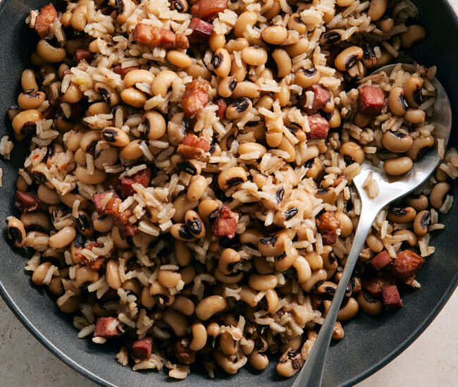 Good morning. Hoppin’ John (above) is a dish of the South Carolina low country, peas and rice cooked together and often served on New Year’s Day as a wish for a prosperous, lucky future. (The peas are meant to represent coins. Some cooks throw a dime into the pot or place the coin under one of the bowls on the table.)