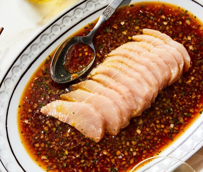 For a dish of hamachi sashimi, Simeon begins with a ponzu sauce, mixing shoyu — the name for soy sauce in Hawaii, a legacy of the Japanese immigrants who sailed to the islands in the 19th and early 20th centuries to work the sugar and pineapple plantations — with kombu, bonito flakes and citrus. It’s a classic flavor combination, but when Simeon was first experimenting in the kitchen, he wanted to make it more local. A CHamoru chef from Guam who saw kinship in their island cuisines had told him about the condiment fina’denne’, which the CHamoru poet Craig Santos Perez has described as “holy water” for every CHamoru celebration: a blend of soy sauce, vinegar or citrus, onions and chiles. In homage to that recipe, Simeon adds sweet onions to the ponzu and ginger in lieu of chiles, for a gentler kick, then shiso for “some effervescence,” he says.