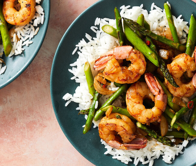 Without access to live shrimp, the next best option is actually frozen. When thawed properly, then tossed with crisp-tender asparagus and sweet onion in this stir-fry, they taste pretty great. Here are four simple steps to making frozen shrimp end up as bouncy and flavorful as their counterparts fresh out of the water.