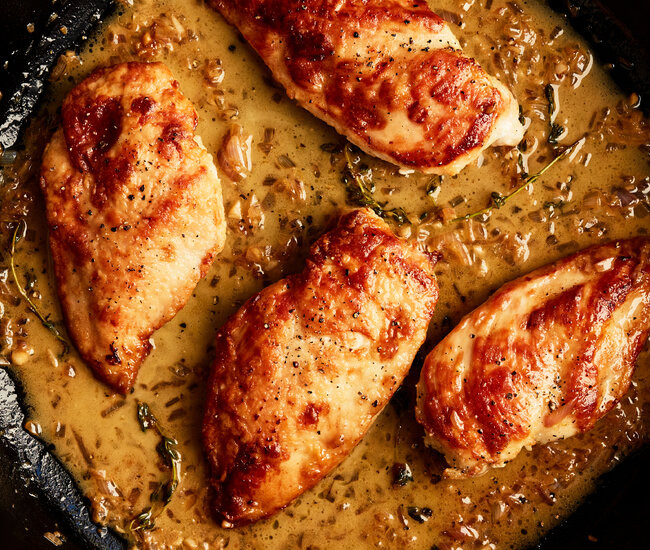 Pierre Franey’s five-star recipe for chicken breasts with lemon solves this problem by searing the chicken quickly on both sides until golden brown and then building a sauce in the same skillet. The meat finishes cooking in the liquid, which keeps it from overheating. The pan sauce is rich and tangy, filled with shallots, thyme, two full teaspoons of grated lemon zest and, of course, butter (a French cook’s answer to most things). And the chicken emerges tender and redolent of citrus and herbs. Pierre suggests serving it over mashed potatoes with basil and olive oil, but I also love it with crispy roasted potatoes, which are easier, anyway.
