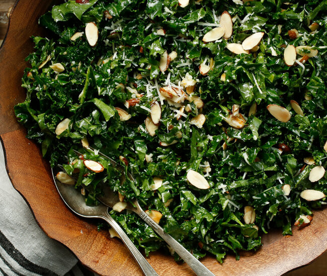 Time for salad! There’s none better than Julia Moskin’s snappy lemon-garlic kale salad (above). It’s simple as kindergarten math: The greens are dressed in olive oil, lemon juice, garlic and salt, then tossed with sliced almonds and a shower of Parmesan. I tend to gild the lily, of course, adding dried cranberries and plump raisins, butter-toasted croutons, and some cubes of Port Salut cheese. Make it your own, and make it this weekend.
