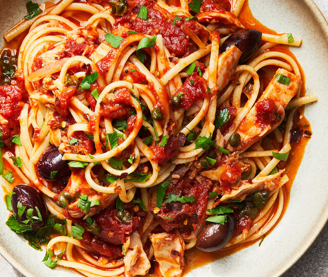 That’s all in the future, though, where everything is seashells and balloons, a dream to hold onto until it shatters, my own little sequel to “Uncut Gems.” In the meantime, there’s dinner to make here at the end of the week: tuna puttanesca (above), spiced brininess with caper pops and olive depth, fiery as you like.