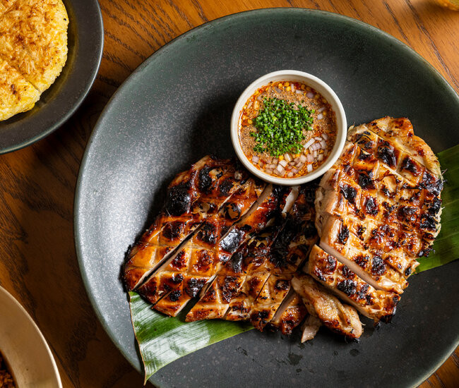 Mr. Wittawat’s background comes through in less obvious ways, too. He works rice as if it were dough, bringing out textures that run the gamut from soothingly chewy to airily crisp. Sticky rice, molded like a hamburger patty and lightly grilled like one, comes with chicken that is cooked over charcoal in the style of a Bangkok street vendor. The rice cake doesn’t taste like much except soy and char, fleetingly, but you can tear off lumps of it to chew on in the pauses between lemongrass-scented bites of chicken, and to dip into the juices left behind on the platter.