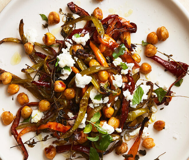 I like to mix fleshy, multihued bell peppers with a medium-spicy pepper (such as Hungarian wax, Jimmy Nardello or Cubanelle) for a range of flavors and a sunset of colors. Tossed with olive oil, salt and herbs, these peppers can form the base of countless sheet-pan meals. Top them with fish fillets, chicken, sausages or simply the canned chickpeas I use here, which crisp and turn golden as they roast.