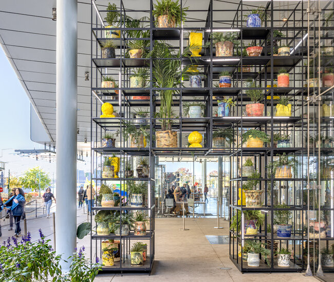 Johnson’s installation, “New Poetry,” is over 15 feet tall, nearly 30 feet wide and five feet deep, and bisects the museum’s facade — part of it is outside, and part inside the new bakery. Its black steel shelves hold a variety of elements including plants, ceramic vessels, books and monitors showing videos, including Johnson’s work “Black Yoga” (2010).