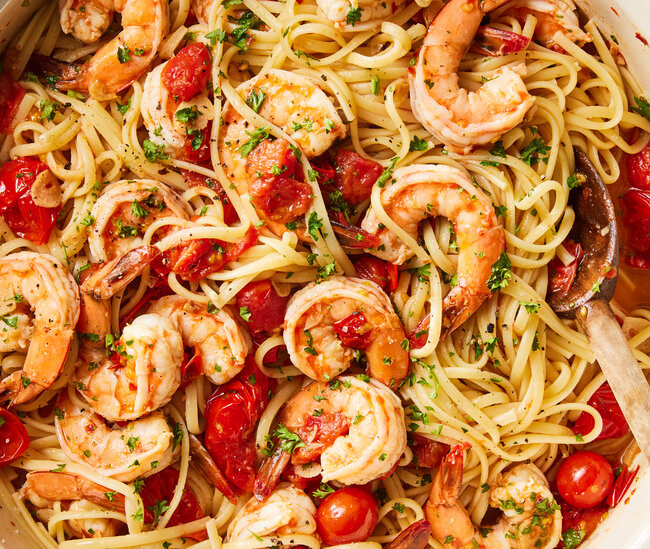 First up is Lidey Heuck’s shrimp pasta, essentially the shrimp version of vongole rosso. Loads of garlic and olive oil — and a healthy splash of white wine — make even the tightest cherry tomatoes feel lush, and the lemon zest and chile flakes added at the end keep things bright and perky. With a bitter greens salad and the rest of the bottle of wine, it’s an excellent dinner for any night on the calendar.