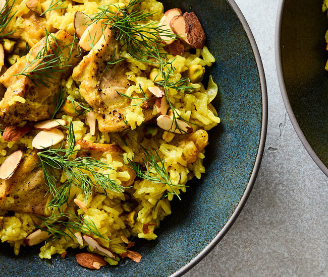Add Kay Chun’s new spiced chicken and rice to that list. Boneless chicken thighs brown in olive oil until golden, and then garlic, cinnamon, cardamom, turmeric and allspice are bloomed in the same oil to release their aromas. (The turmeric is a thoughtful swap for saffron, which can be pretty pricey.) Then go in the rice, broth, golden raisins and pistachios for a quick, gentle simmer. Top with toasted almonds, and there you have it: some extremely nice chicken and rice.