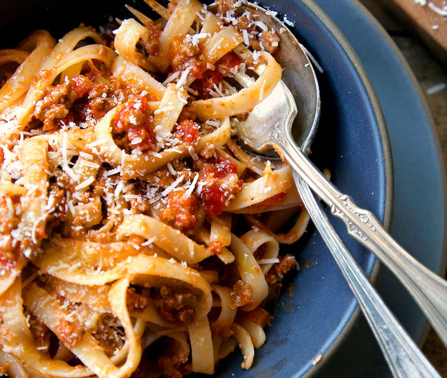 Well, apart from fresh-baked apple pie, that is. And wooden boats, spit-roasted lamb, fresh-cut hay and Jamaican black cake. But Bolognese is pretty great: that milk-calmed tomato over a bass line of beef, with a whisper of nutmeg warmth and a low hum of buttery onion. It’s just the thing for a Sunday afternoon of winter cooking, grandma-style, in advance of a family dinner.