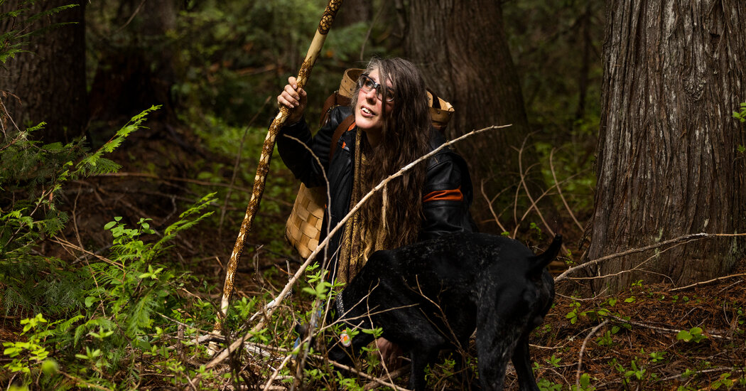 Beneath a row of fir trees River Shannon Aloia walks along a remote dirt road on national forest land, scanning the ground for