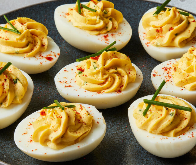 But I like to offer a little nibble along with drinks to help people settle in. Alex Witchel’s deviled eggs (above) are an American mainstay, easy to make ahead and a perfect foil to a colorful tequila sunrise (or any cocktail, actually — classic whiskey sours, fruity sangria or energizing espresso martinis, for example).