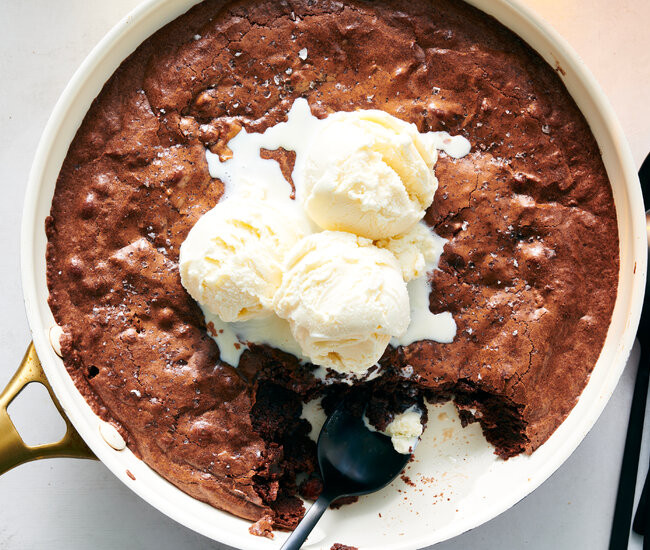 And it is so easy. Mixed and baked in one skillet, you don’t have time for second thoughts. And leaving the brownie in that skillet for serving, instead of cooling and cutting it into neat bars, is an invitation to dig right in, preferably while its belly is warm, gooey and a little wobbly. And while you’re at it, adding a scoop of ice cream never hurts, especially since it melts into a custardy puddle, soaking into the fudgy confection.