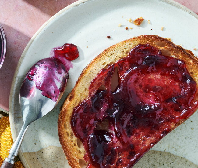 All these years later, I know that, when Concord grapes have reached their peak ripeness, it’s time to make this jelly. This recipe is different from the method I learned at Pies ‘n’ Thighs, where the grape skins are separated by popping out the soft interior, then added back in to make a jam. Here, the whole grapes are put in a pot with water, heated until soft, then crushed. Lastly, the grape juice is strained of seeds and skins. Pectin, a little lemon juice and sugar are the only other ingredients.