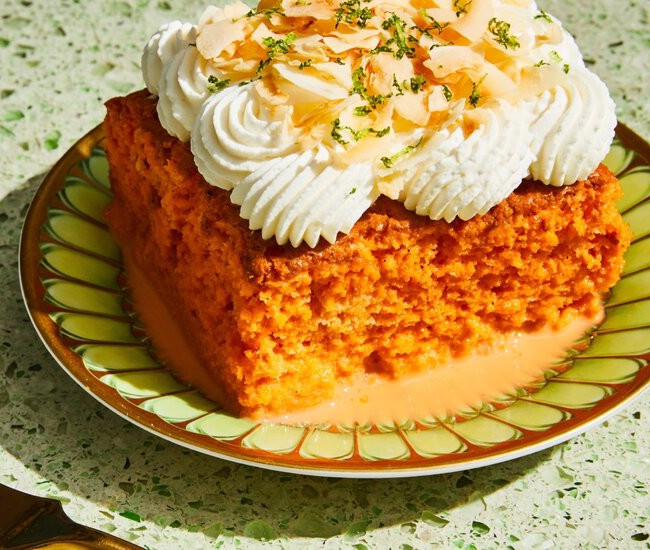 Yoo pokes holes all over, then pours the Thai tea-milk mixture slowly, pausing for it to be fully absorbed before pouring more, until everything is orange. Then the waiting begins. Yoo goes so far as to leave the cake in the refrigerator for two nights, flipping it in between. “So gravity can do its work,” he says. The cake is finished with whipped cream, coconut flakes toasted near gold and lime zest with its bright sting. Most important is to keep it cold, in the refrigerator until the last moment. A chill on the tongue, then it melts. Is it cake? Is it ice cream? Why not both?
