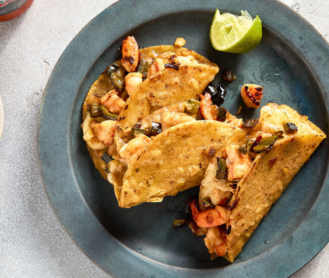 Specifically, these cheesy shrimp tacos (above), a take on tacos Gobernador. The original is a dish out of Sinaloa, Mexico, where it’s said to have emerged from the restaurant Los Arcos, in coastal Mazatlán, in the early 1990s. Christian Reynoso’s version amps up the flavor: chopped shrimp sautéed in butter with garlic and Worcestershire sauce, poblano chiles and diced onions, with melted cheese on flour tortillas. You might add some oregano or cilantro, a smidge of tomato paste, a few chopped tomatoes. But don’t omit the Worcestershire sauce, which offers a nice umami pop against the sweetness of the shrimp.