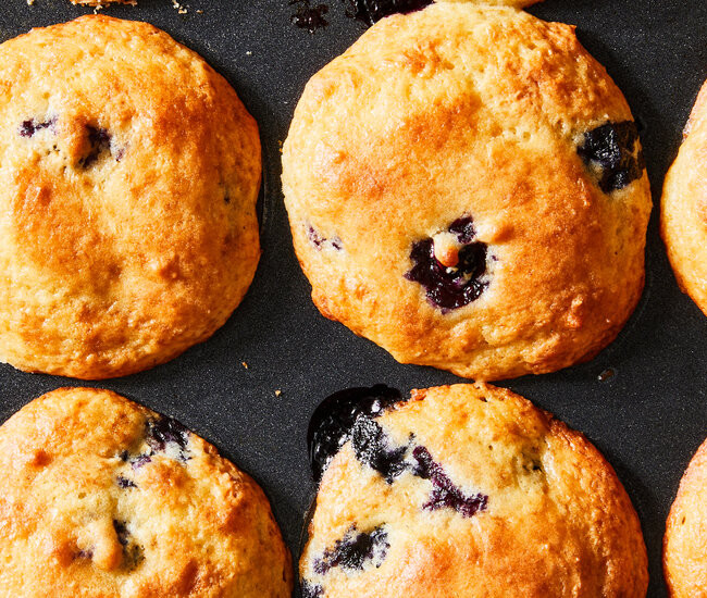 To ensure a high rise for muffins that are still sturdy enough to stand with pockets of juicy berries, both baking soda and baking powder are whisked into the dry ingredients. When baking soda, which is a base, hits the acid of yogurt, it quickly releases carbon dioxide gas and makes the batter bubble up quickly. That gives it both airiness and an extra-big muffin top. Baking soda also promotes browning, so that muffin slope burnishes to a deep coppery amber.