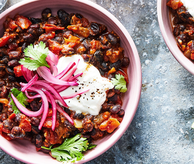 My vegetarian skillet chili is high on the list. This 30-minute meal, a heady mix of chile-spiced beans and tomatoes, gets its punch from quick lime-pickled onions piled on top. Dollop on some sour cream to add extra richness.