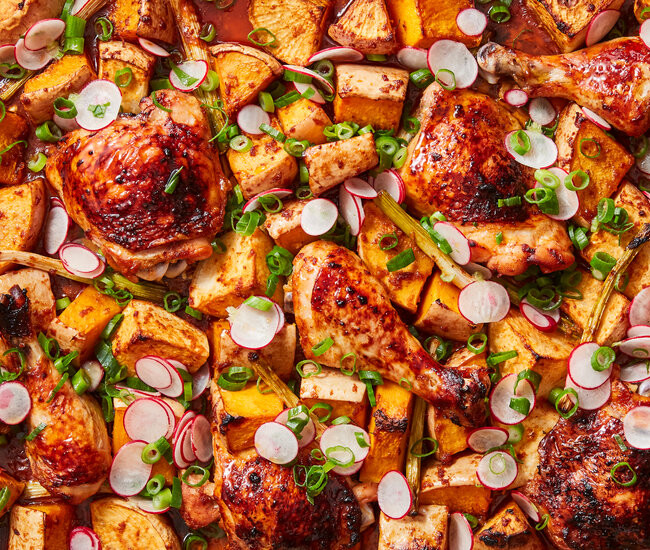 Mine are mostly destined for the sheet pan so they can get sweeter and golden at their edges, just like in Yewande Komolafe’s gochujang chicken and roasted vegetables. She uses the umami-rich Korean fermented chile paste as a base for a glaze, zipped up with grated ginger and soy sauce, then smeared on bone-in chicken and all those beautiful butternuts (turnips, too!). While everything roasts, turning crisp and bronze, make a quick pickle with radishes and scallions, which adds loads of brightness and texture to this hearty, autumnal dish.
