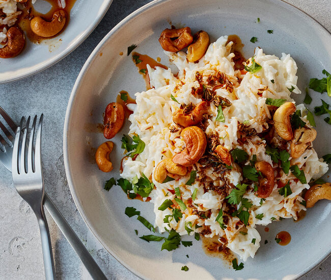 Priya Krishna’s new recipe is a fuss-free dinner for those nights when you have no time and the fridge is basically bare (and fall tends to include a lot of those nights). Cooked rice is folded into a swirl of tangy yogurt and sharp ginger, and that creamy mix is then topped with cashews and spices that have been sizzled in ghee. It’s a comforting dish that’s there for you when you need it — “I eat yogurt rice over the sink at 9 p.m.,” says Priya.