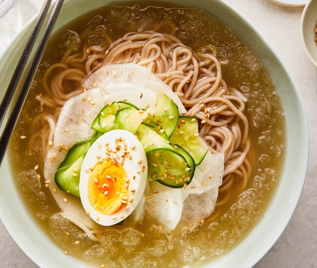 It didn’t hurt that Kim’s post-tennis noodles by the sea were like a mix between mul naengmyeon and the more salad-y bibim naengmyeon, where a bright crimson gochujang-based sauce replaces the chilled beef broth. Providing the best of both worlds, this hybrid Busan iteration was the gateway bowl that turned her into a naengmyeon lover, not a fighter. Learning not only to love naengmyeon but to need it as well is a rite of passage for Koreans and non-Koreans alike. If you, too, want to follow that path, then I would recommend trying Olle’s naengmyeon, either at the restaurant or with this recipe. The secret ingredient to mul naengmyeon, I’ve found, is the mul, or water. Whether pulled from a jar of dongchimi (radish water kimchi) or poured cold from your pitcher filter, water is a powerful ingredient: When mixed with a rich beef yuksu, the brothy foundation of this dish, then chilled for a couple of hours, it becomes a savory slushy that makes the noodles taste even more divine.
